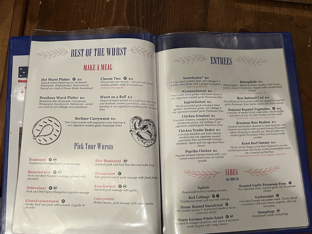 Pretzel, a sausage of your choice, hickory smoked bacon, 2 fried eggs, sauerkraut and home potatoes