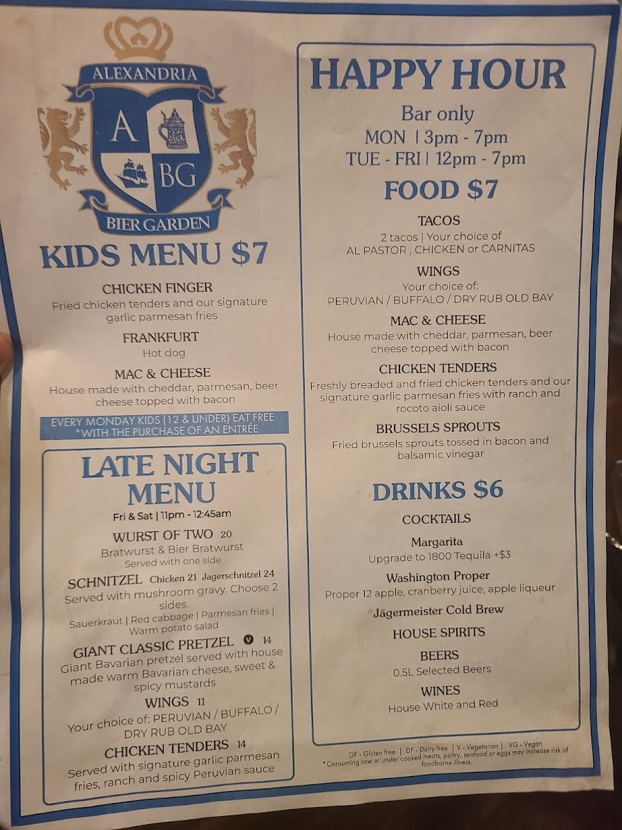 Welcome to Alexandria Bier Garden, a lively gem located at 710 King St, Alexandria, VA. This restaurant artfully combines the vibrancy of a traditional beer hall with modern flair, ensuring an unforgettable experience. The drinks menu boasts an impressive array of beers, from classics like Guinness to unique options such as Vasen Pineapple Over Guava, catering to diverse palates.